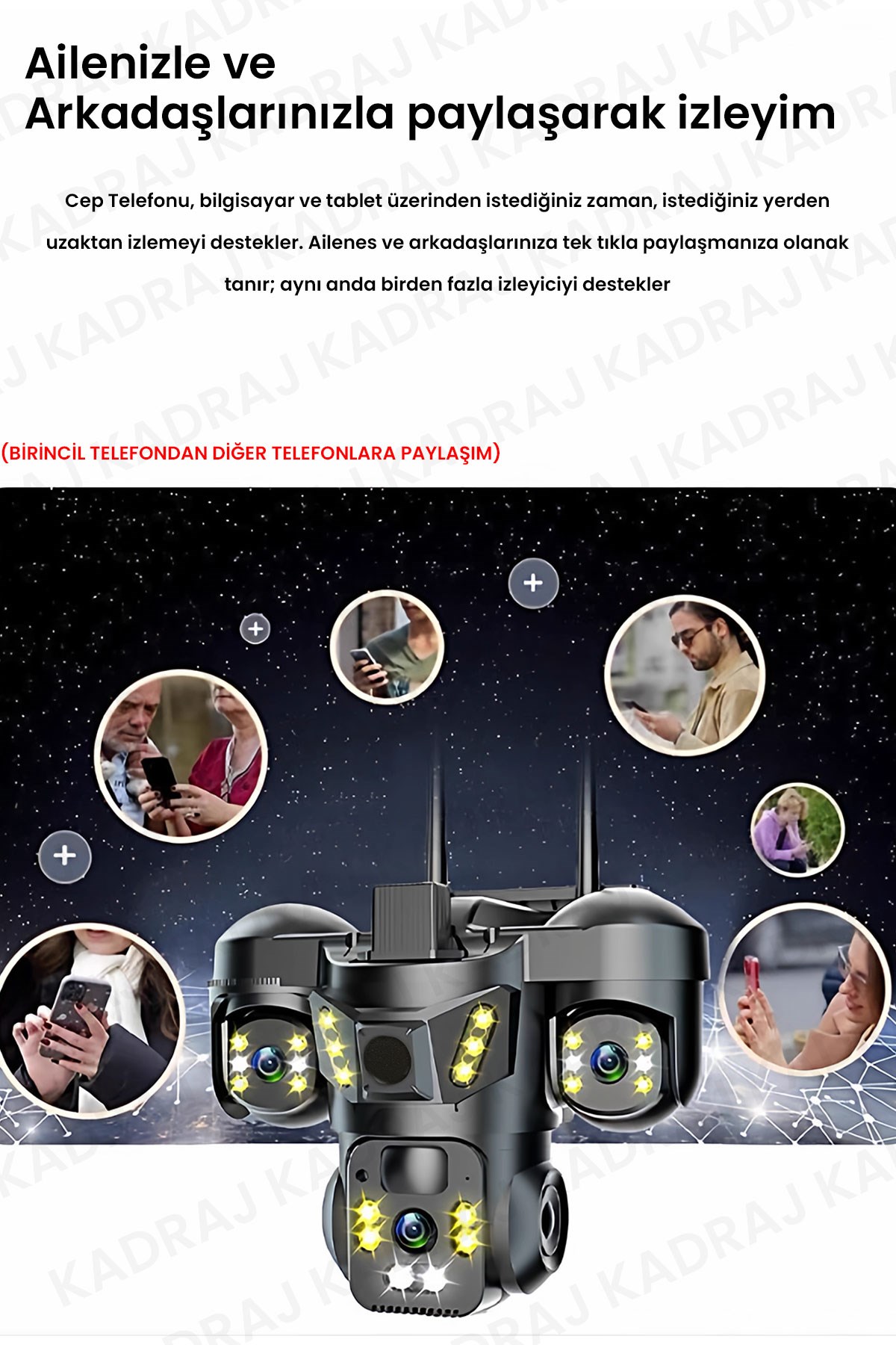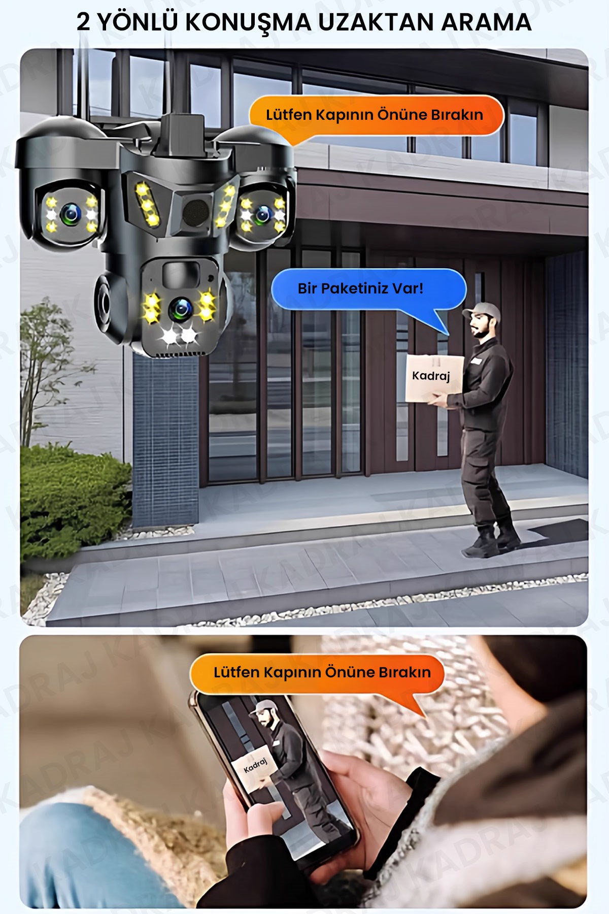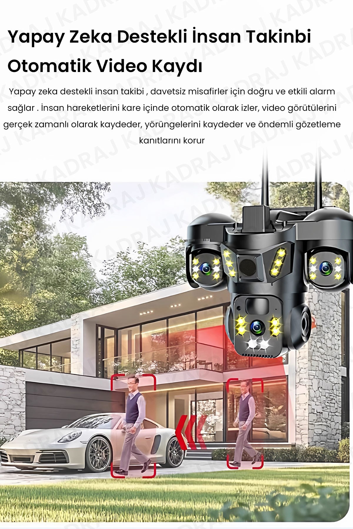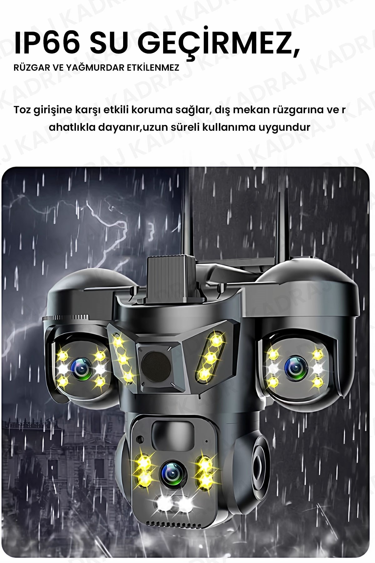 Kadraj X66B, üç ayrı kamerası ile klasik güvenlik kameralarının çok ötesinde bir koruma sağlar. 15 MP toplam çözünürlükte (5+5+5 MP) üç lens aynı anda farklı açıları izler; böylece hem bahçe girişini, hem kapıyı, hem de yan alanları tek cihazla kontrol altında tutabilirsiniz. Ürünle birlikte gelen 128 GB SD kart sayesinde ek masraf yapmadan yüksek kapasiteli kayıt imkânına sahip olursunuz.