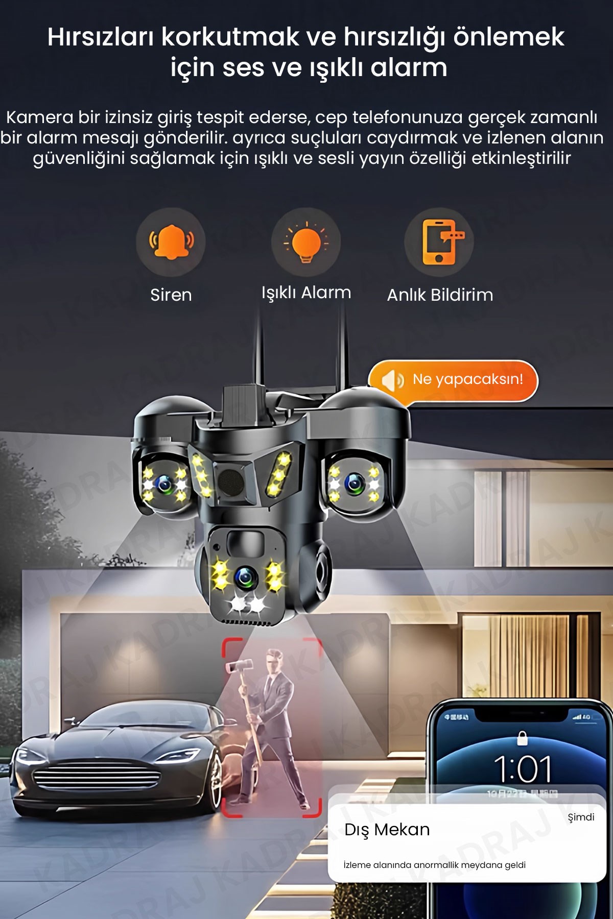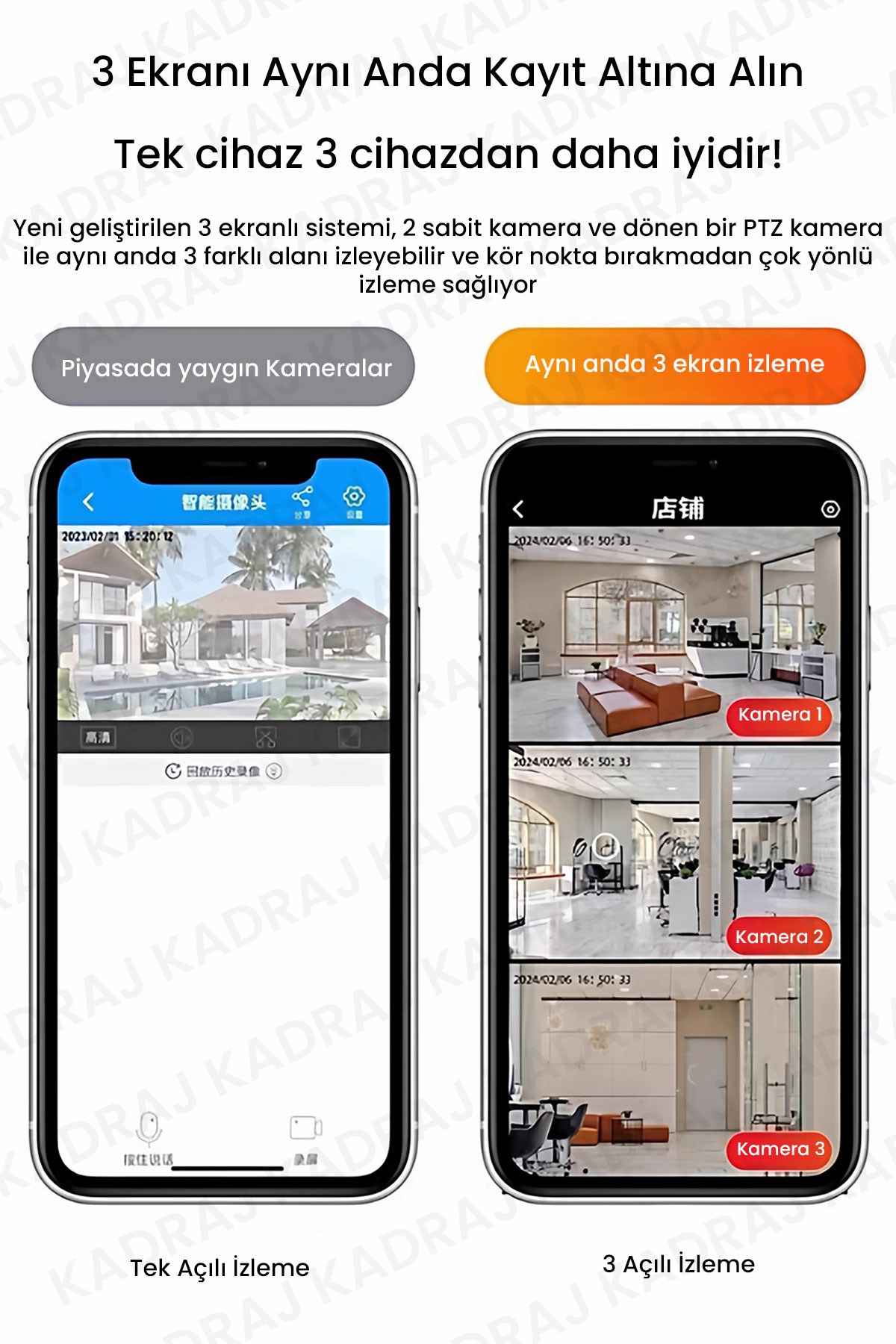 Böylece tek cihazla üç farklı alan aynı anda görüntülenir ve kör nokta tamamen ortadan kalkar. Depolar, bahçeler, site girişleri, otoparklar gibi geniş bölgeler için kusursuz bir izleme sağlar.